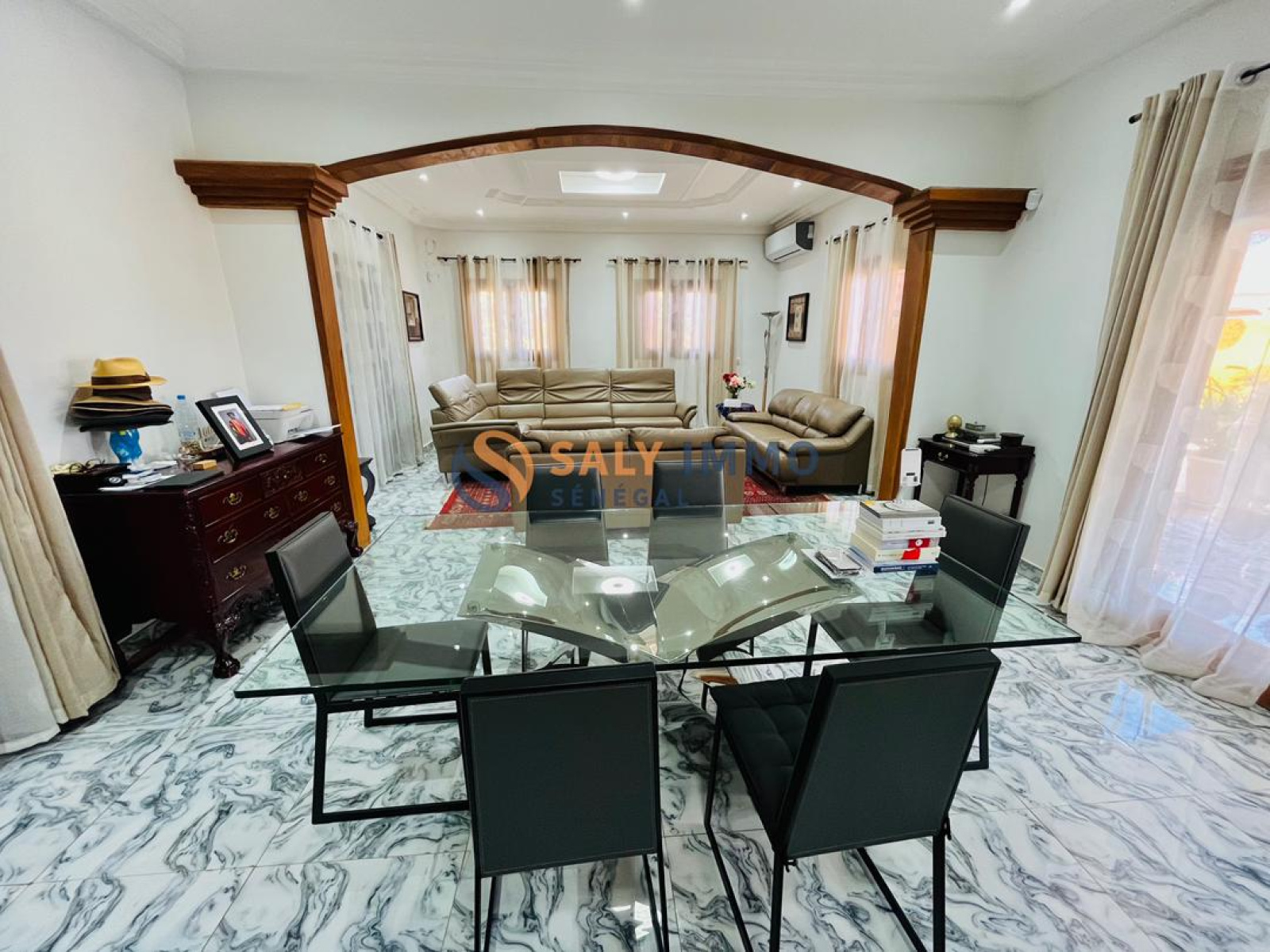 Cette villa spacieuse et soigneusement entretenue offre un cadre de vie exceptionnel. Elle comprend 5 chambres, 8 salles de bain, un salon, un séjour, une cuisine fermée, ainsi que plusieurs pièces annexes pour le personnel (chambre de bonne, chambre de gardien). À l'extérieur, vous profiterez d'un jardin arboré, d'une grande piscine avec abri, d'un parking pouvant accueillir jusqu'à 4 véhicules, d'une terrasse aménagée et de nombreux rangements. La villa est équipée de panneaux solaires (maison + piscine), surpresseurs, système d'alarme, et bénéficie d'un entretien régulier assuré par une équipe complète : gardien, femme de ménage, pisciniste et jardinier. Un bien rare, spacieux et convivial, idéal pour une vie de famille ou un projet résidentiel de standing.