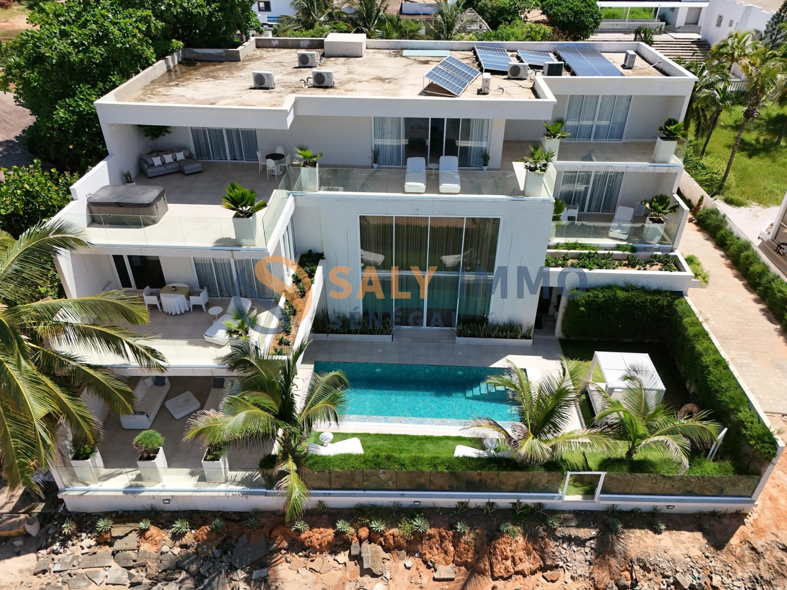 Composition•3 chambres, dont :•1 penthouse d’exception avec jacuzzi privé•2 cuisines modernes et entièrement équipées•2 chambres du personnel•Ascenseur desservant tous les niveaux•Garage•Piscine chauffée grâce à un système solaire•Adoucisseur d’eau•Groupe électrogène